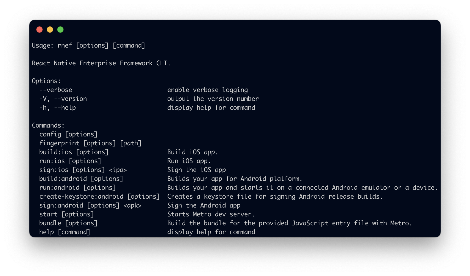 CLIThe RNEF CLI is a command-line tool that helps you develop, build, and run React Native applications.